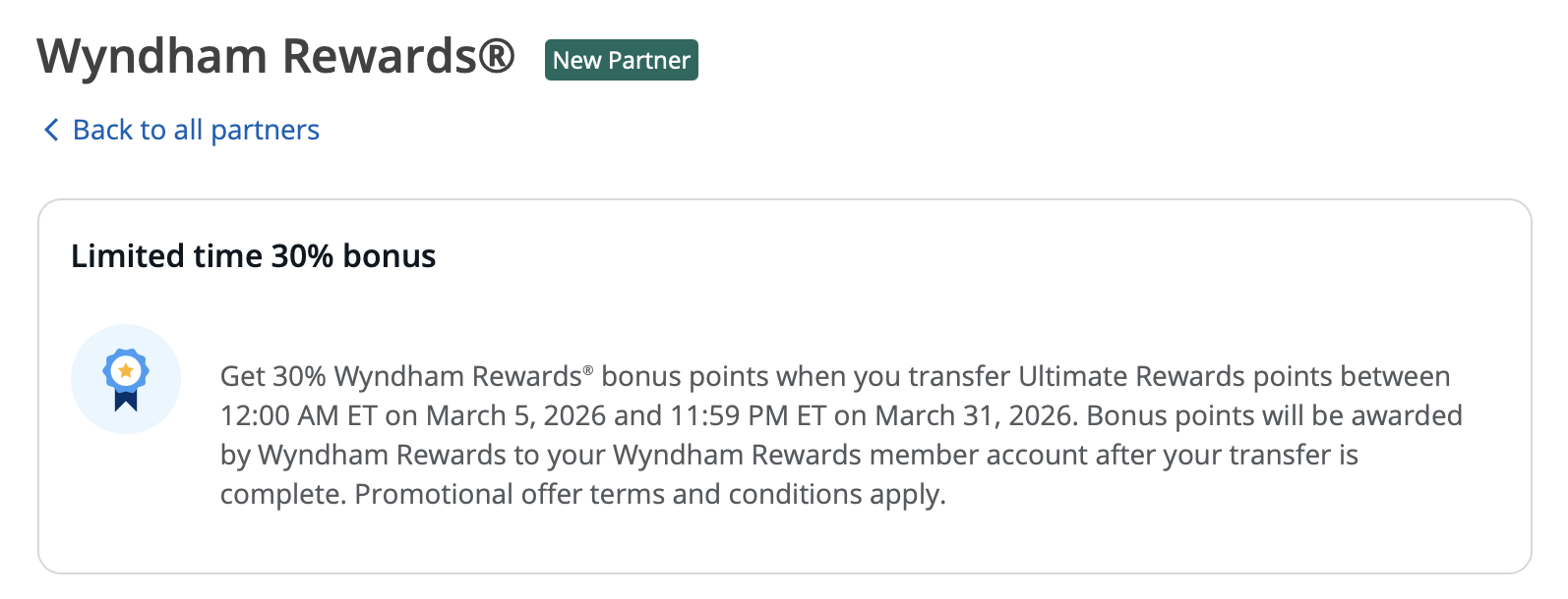 本帖用于长期更新汇总各类转点促销活动! 【2026.3 更新】Chase UR -> Wyndham Rewards 30% Bonus 即日起至 11:59 PM ET March 31, 2026,Chase UR 转至 Wyndham Rewards 有 30% 的加成,无需注册,没有上限。Wyndham 是 Chase UR 最近新增的酒店转点伙伴。平时Citi往Wyndham转点b...Read more The post 转点奖励活动汇总【2026.3 更新:Chase UR -> Wynd…