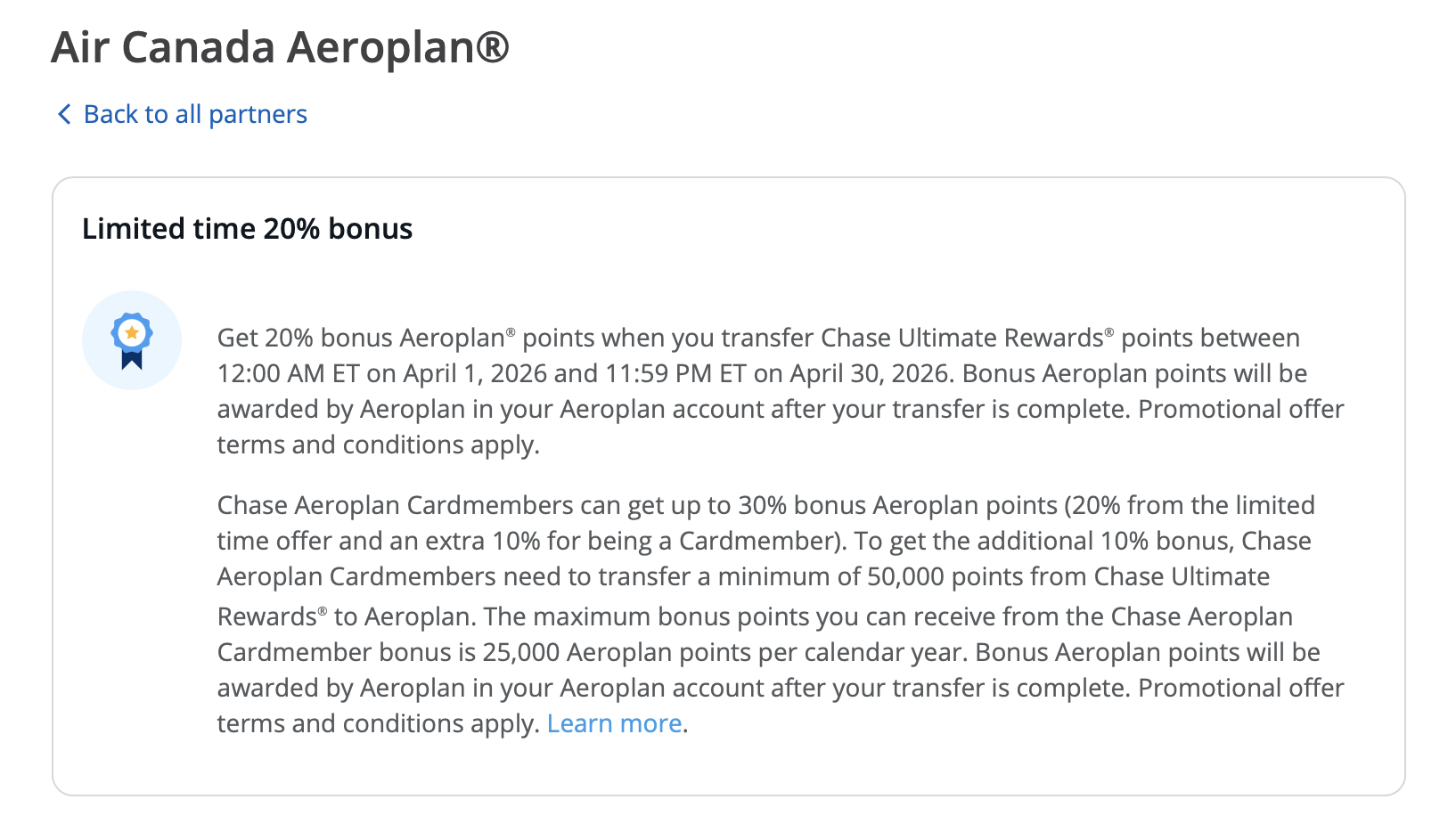 本帖用于长期更新汇总各类转点促销活动! 【2026.4 更新】Chase UR -> Air Canada Aeroplan 20% Bonus 从4月1日至4月30日,从 Chase UR 转点到 Air Canada Aeroplan 有 20% 的加成。如果你还是 Chase 加航卡的持有者,并且尚未用完 Chase 加航卡的 10% 转点加成(加成部分 25000 里程为上限),那么...Read more The post 转点奖励活动汇总【2026.4 更新:Chase UR -> Air …