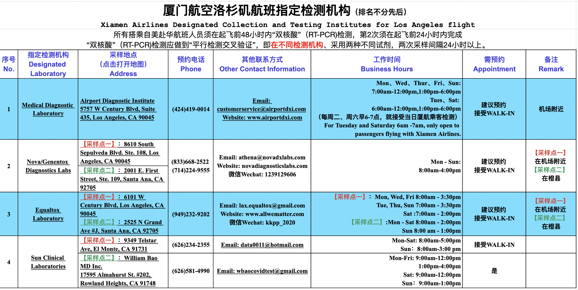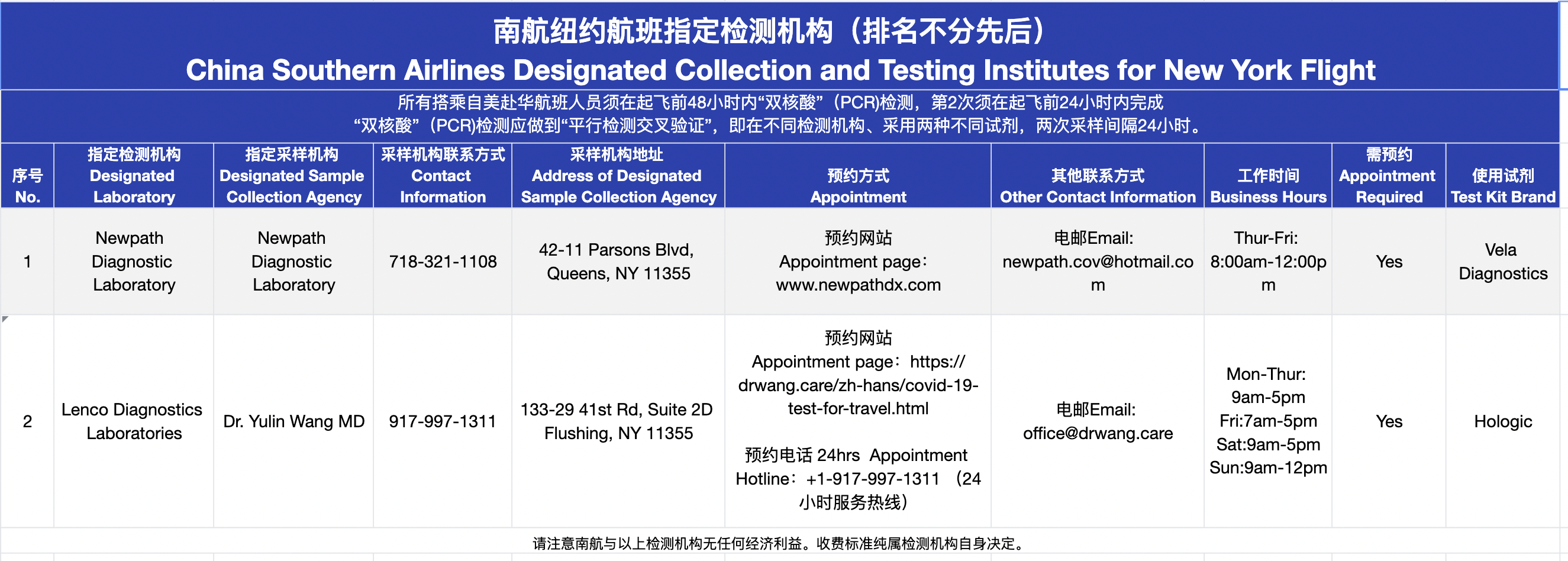 A:目前除了南航和厦航以外,没有指定检测机构了。南航和厦航依然需要提前2-3天到达洛杉矶/纽约,在原指定机构完成双检。