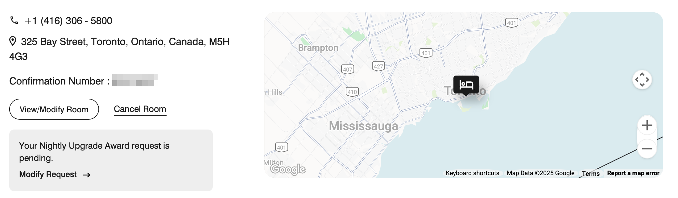 例如我已有一个多伦多瑞吉的预定。在万豪个人账户中,找到这个预定,点击 View/Modify Room。
