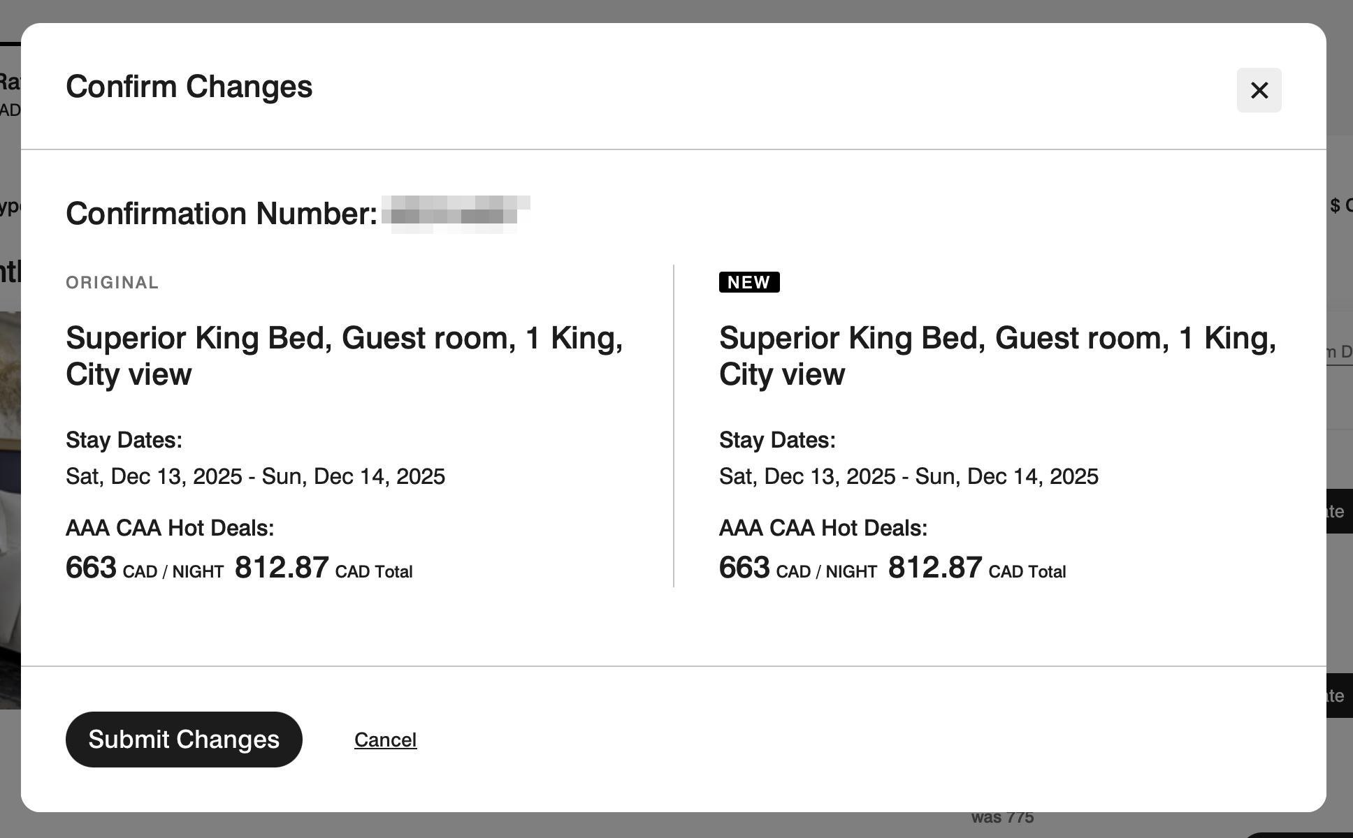 其他集团应该也有类似的功能。但如果你要用凯悦的网页,这么操作会遇上一个bug,直接修改系统会提示更新完成,但你回到预定详情会发现价格没变。需要先修改至其他房型,然后再修改回来,才会更新价格。