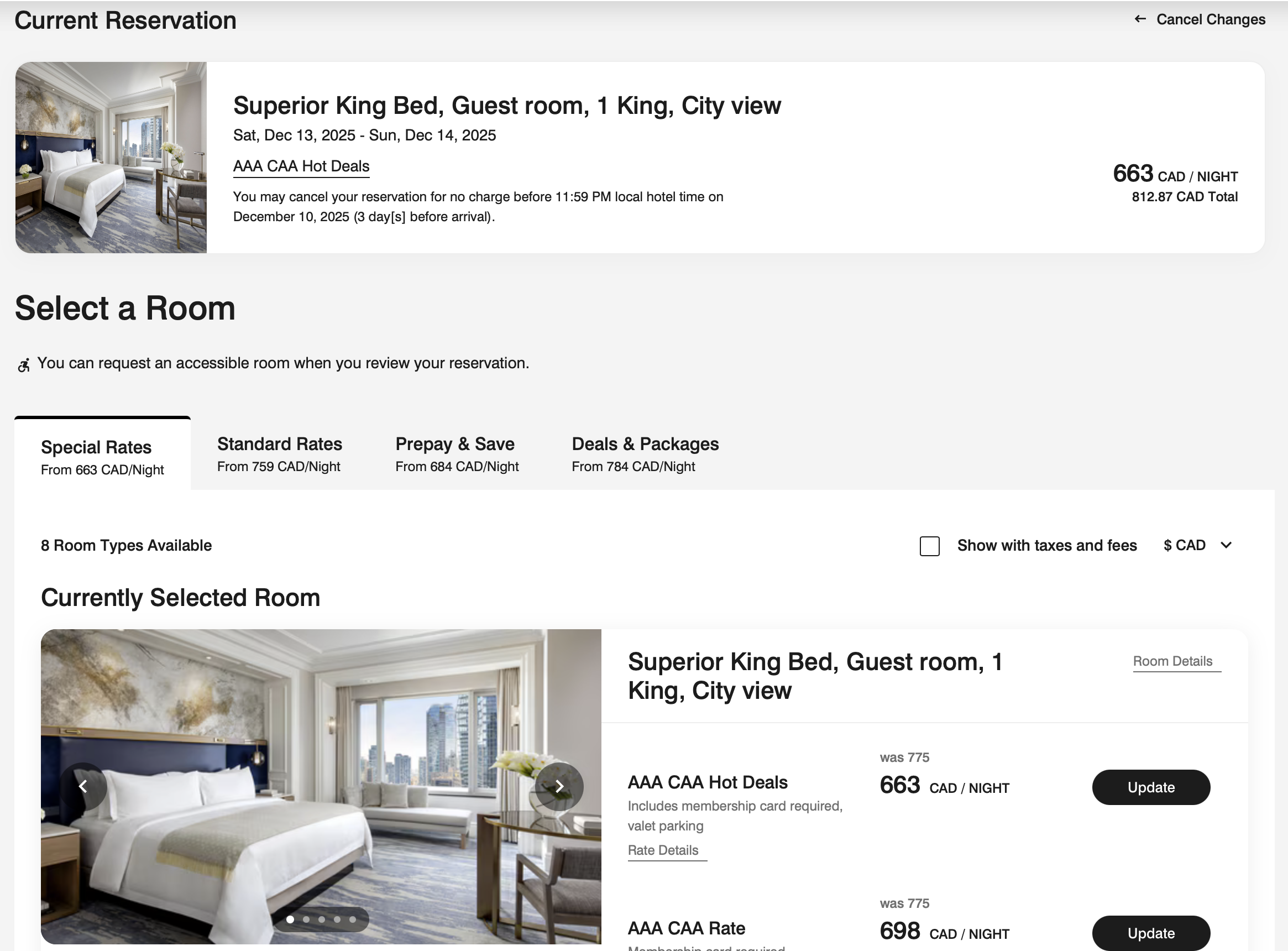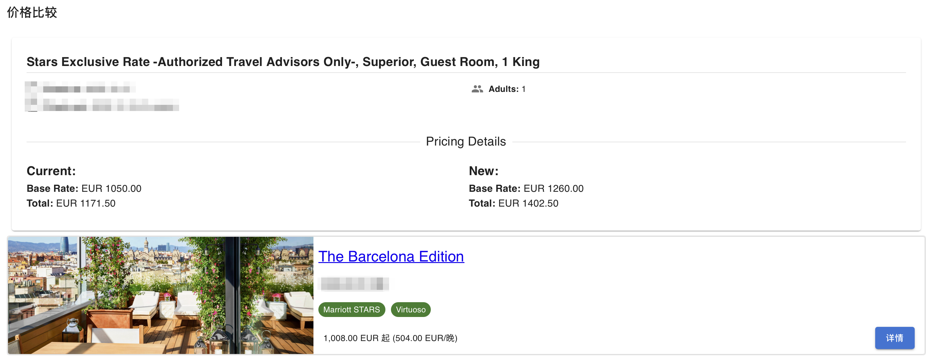 网页会直接按照该酒店对应日期,返回当前价格,并且默认把之前预定房型的价格置顶,方便对比。注意,对万豪来说,默认只返回官网什么条件都没加的价格,如果预定了需要输入折扣码/AAA这样的价格,需要手动修改价格搜索条件,然后系统会按照对应条件重新搜索并匹配房型。