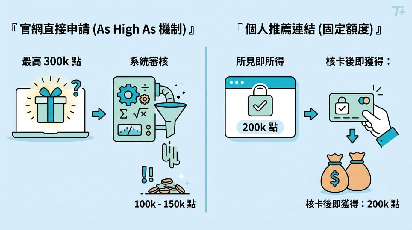 - 建議的應對策略:現階段透過親友提供的個人推薦連結進行申請,多數仍屬於「固定」額度的穩定模式。只要申請頁面顯示的點數為固定數值,而沒有看到「As High As」的字樣,核卡之後達成開卡禮的所需消費額度,所獲得的獎勵就會是該數值。但由於這類透過親友提供的推薦連結,未來也可能被這樣的新機制取代,建議有計畫申辦的消費者,應優先尋求個人推薦連結申辦,以規避系統隨機給予開卡禮點數獎勵的不確定性。