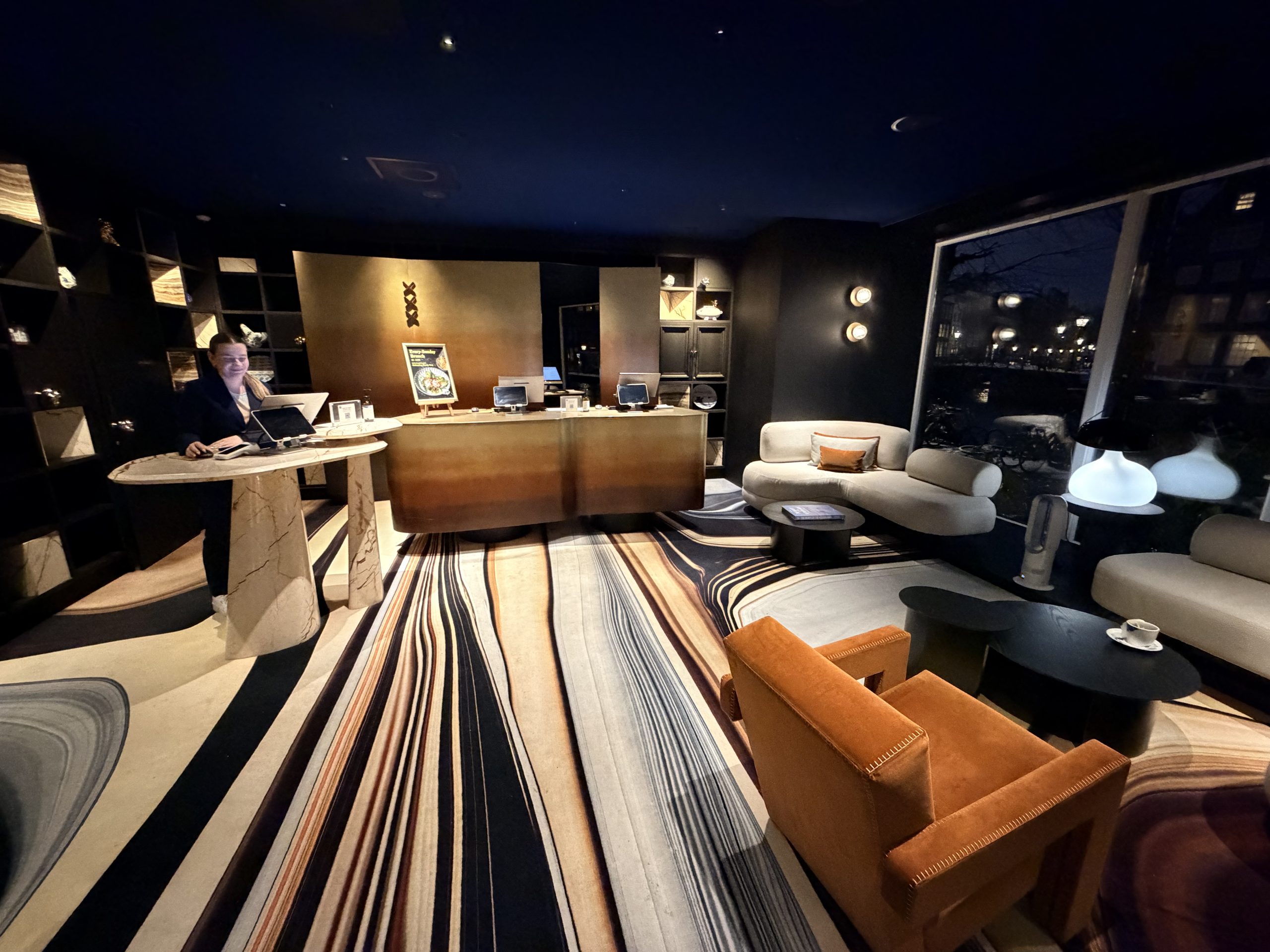 整個大廳帶著一種流動性,除了牆面上的櫃子之外,幾乎看不到其他有直角的物品,地上的地毯感覺就像是運河,而家具們像是水中的小船與石頭
