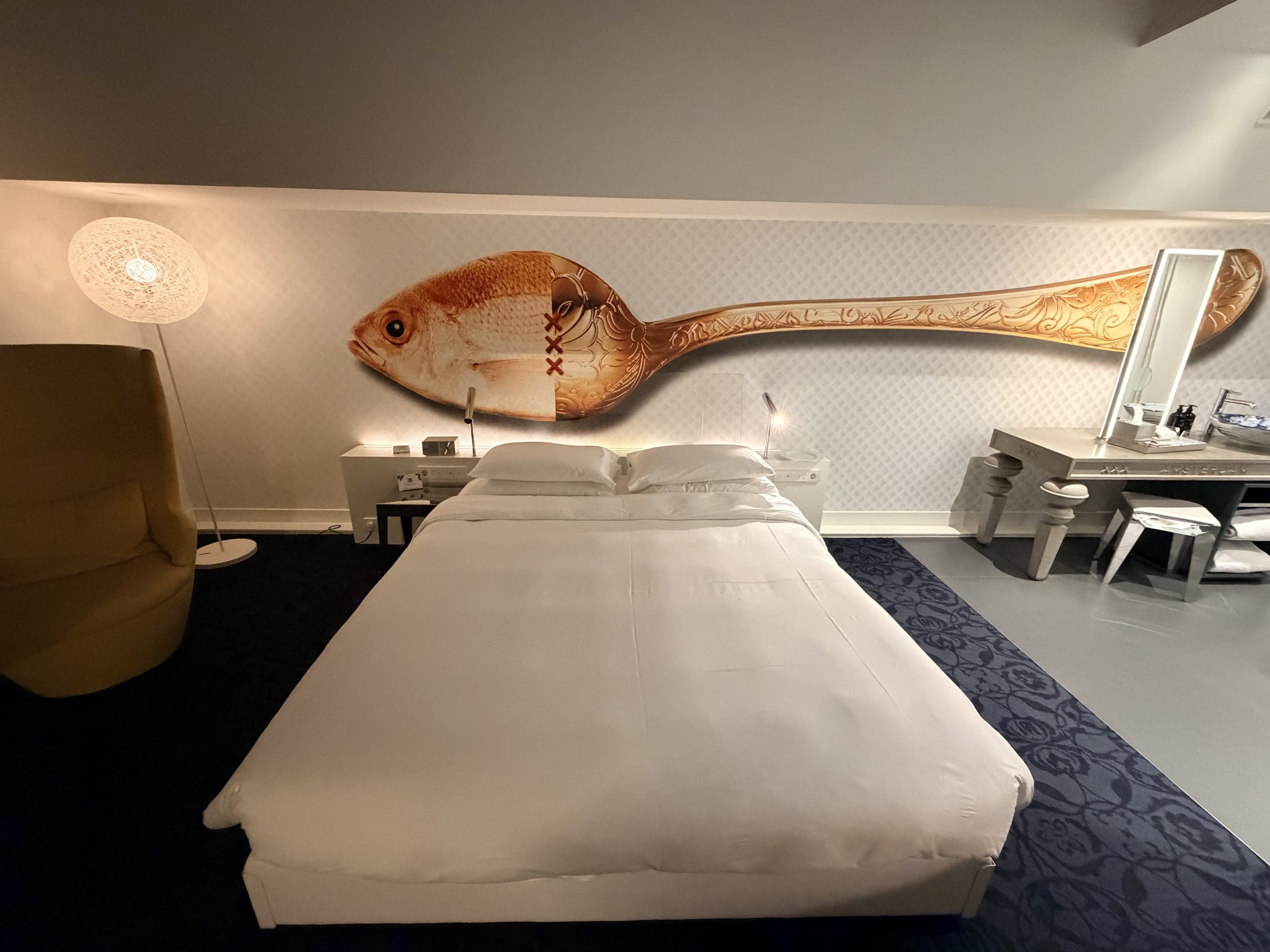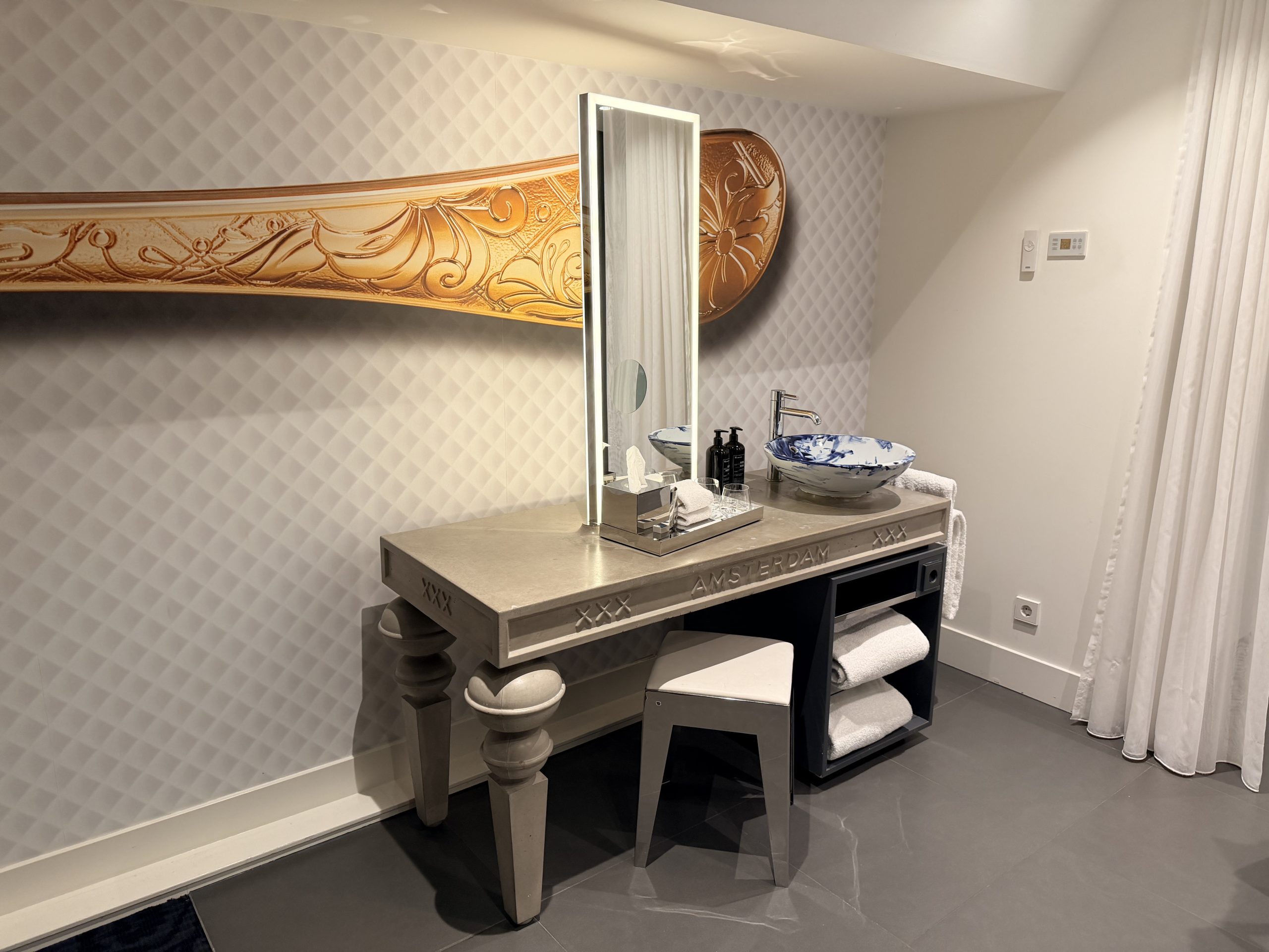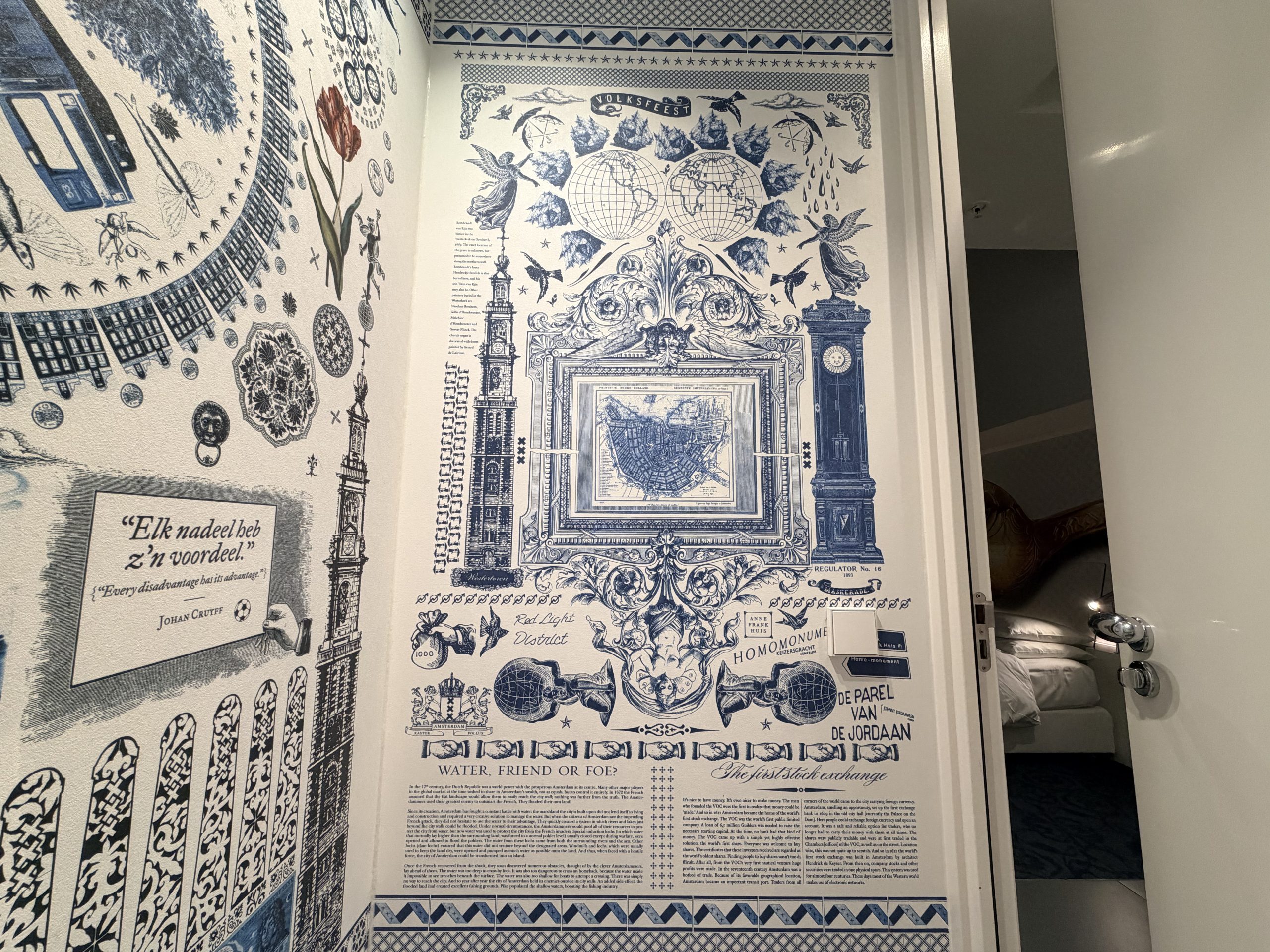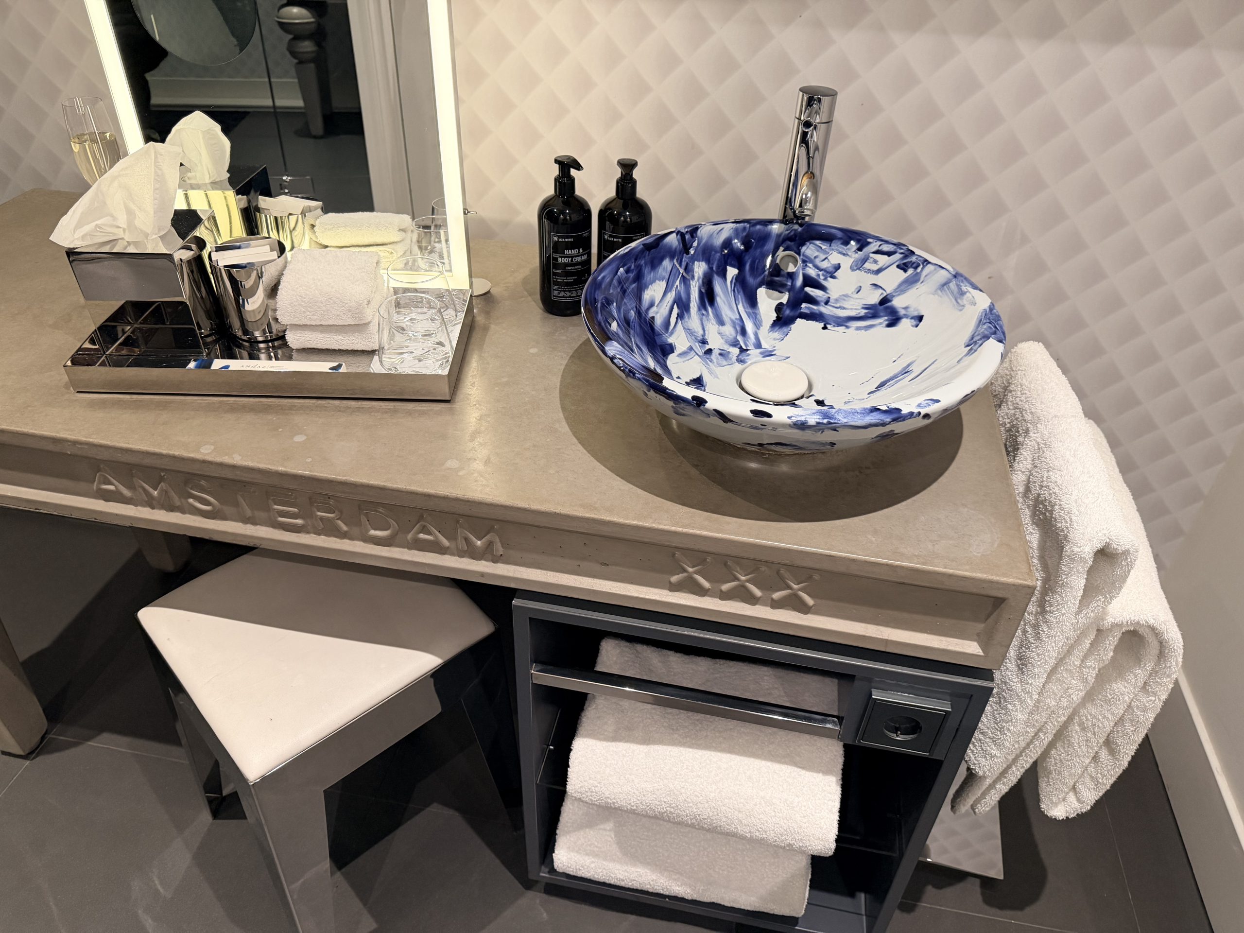 我這次入住的是運河河景大床房,房間大小約28~32平方公尺,一入口就是與房間融為一體的浴室,房間多處會看到阿姆斯特丹的象徵符號「XXX」,關於三個「X」的象徵意義,最常見的解釋是它們代表城市歷史上需要面對的三大災難,也就是洪水,火災與黑死病(瘟疫),這三個「聖安德魯十字」逐漸被解讀為城市歷史苦難與韌性的象徵,也是阿姆斯特丹的市徽。另外,房間內很多小裝飾也都很有趣,像是四處忘了收的盤子,有鬱金香意象的椅子,藍瓷的洗臉槽等等,是個很有設計感的房間。