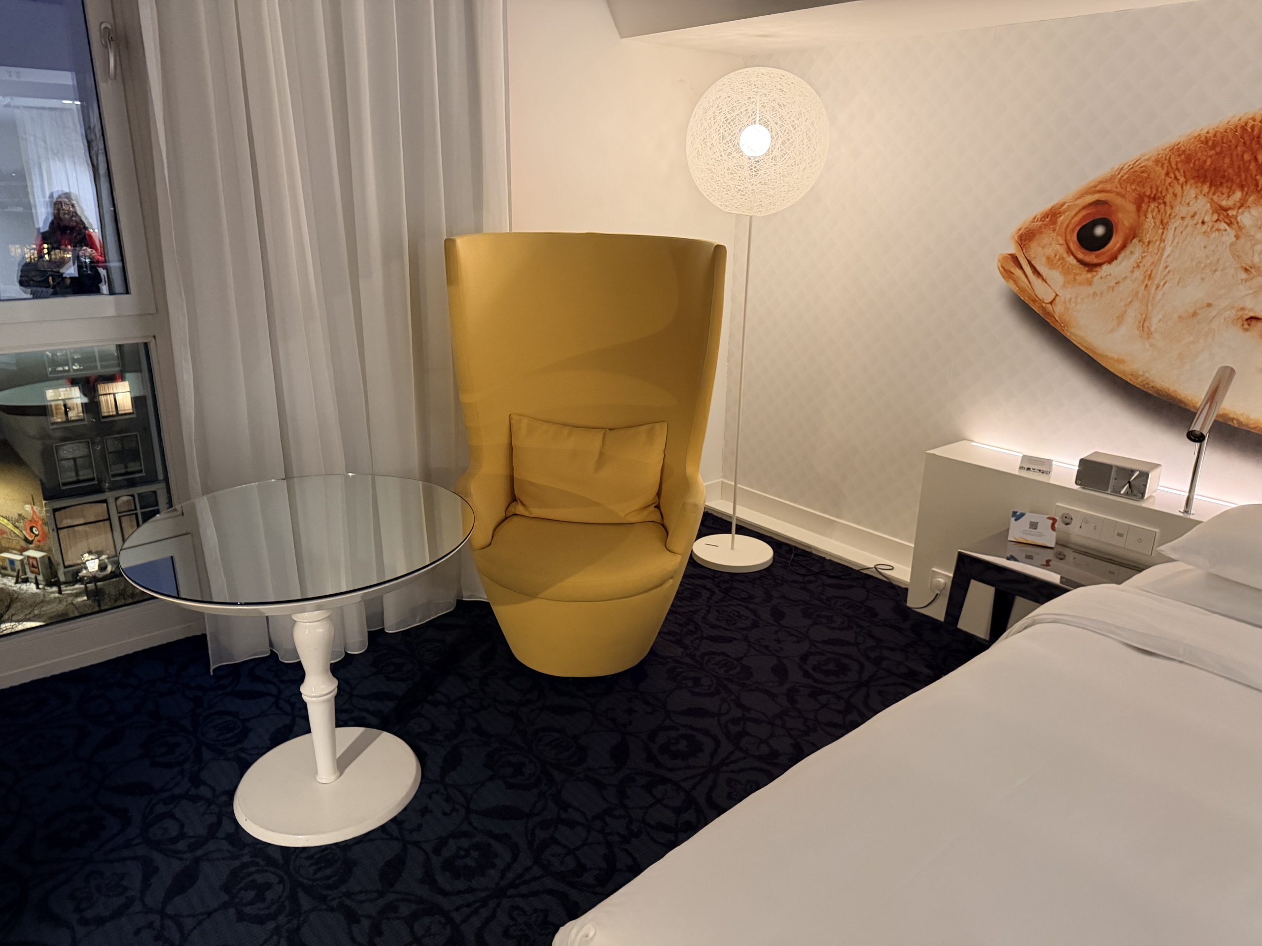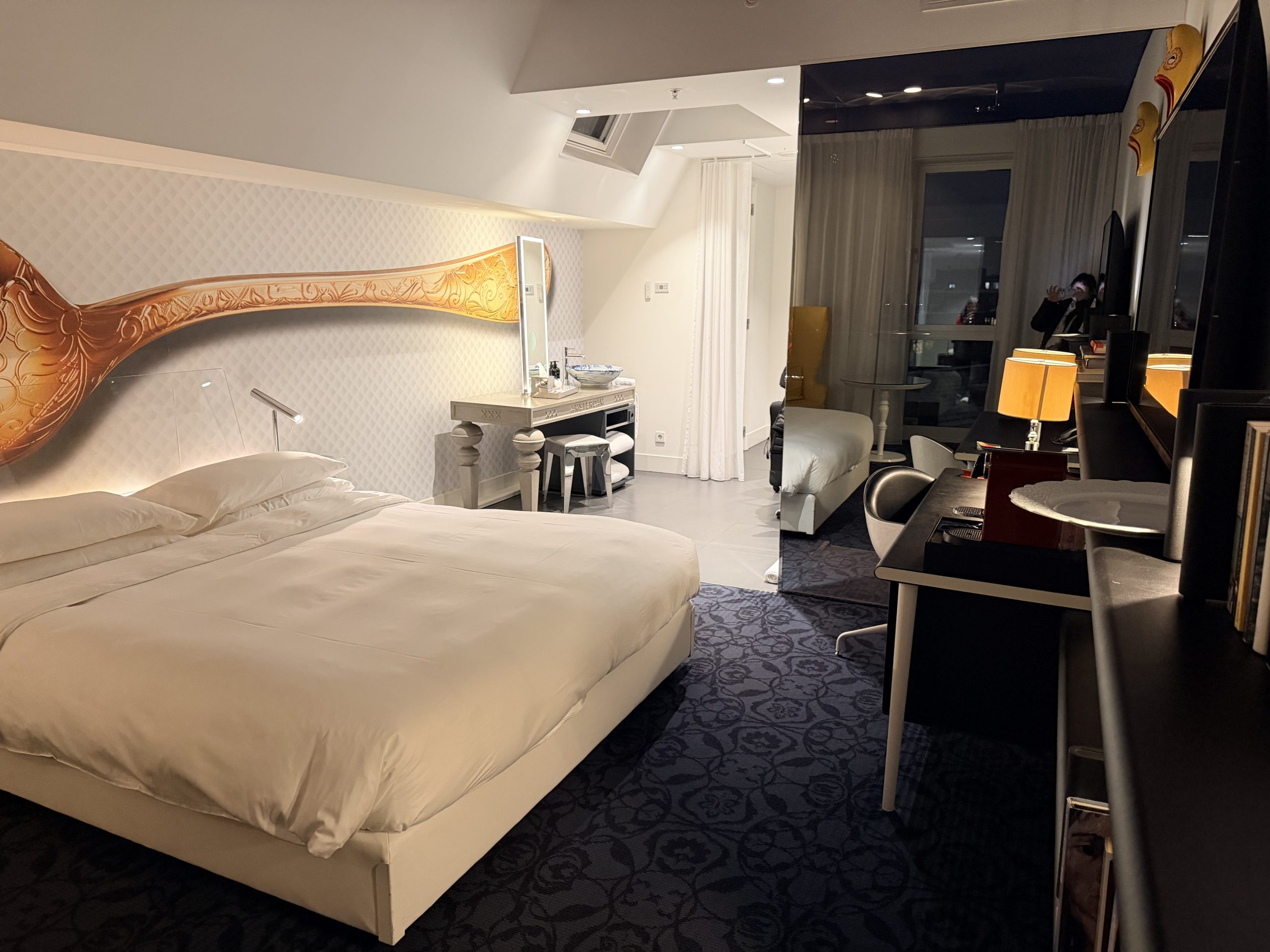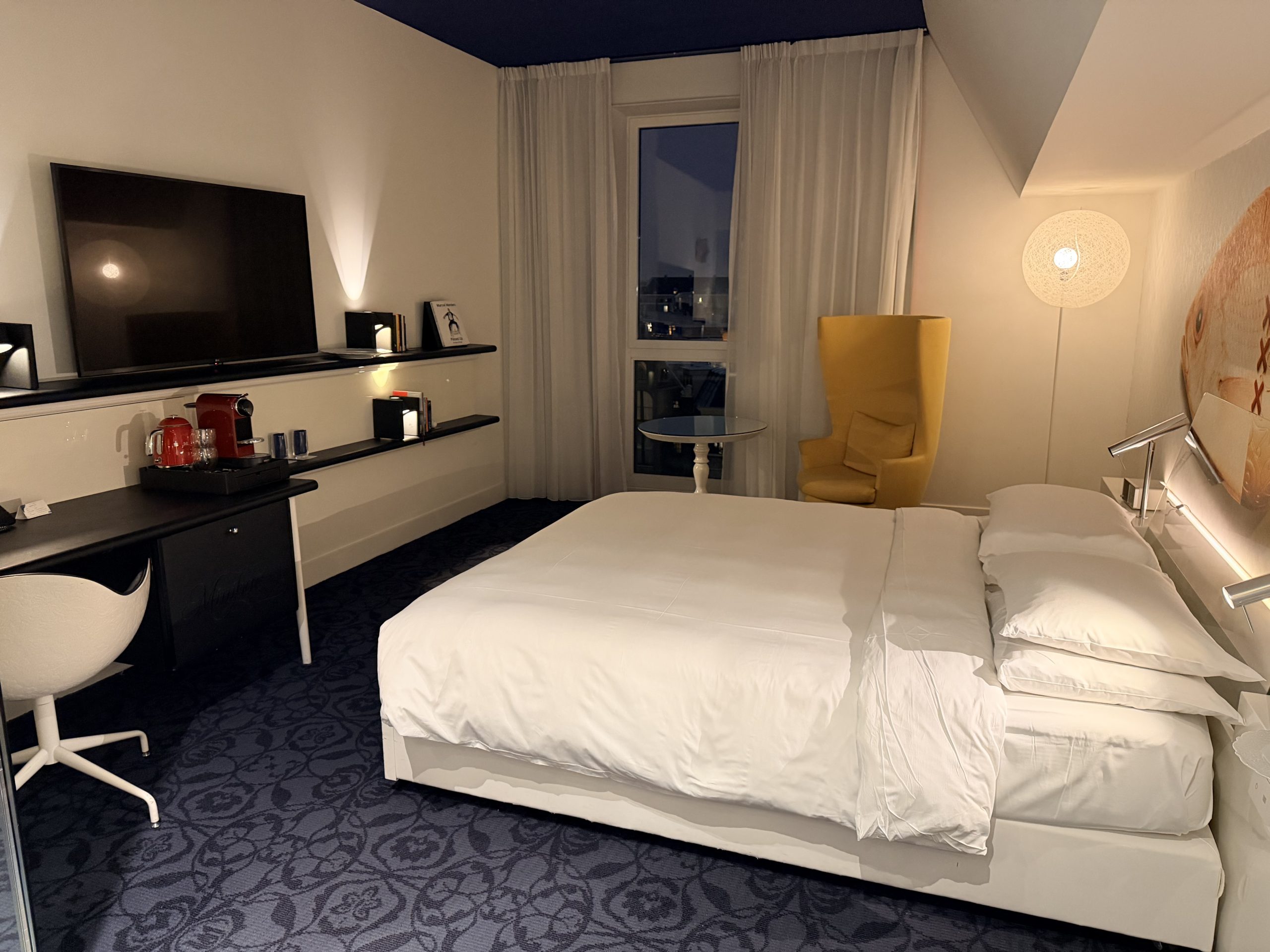 我這次入住的是運河河景大床房,房間大小約28~32平方公尺,一入口就是與房間融為一體的浴室,房間多處會看到阿姆斯特丹的象徵符號「XXX」,關於三個「X」的象徵意義,最常見的解釋是它們代表城市歷史上需要面對的三大災難,也就是洪水,火災與黑死病(瘟疫),這三個「聖安德魯十字」逐漸被解讀為城市歷史苦難與韌性的象徵,也是阿姆斯特丹的市徽。另外,房間內很多小裝飾也都很有趣,像是四處忘了收的盤子,有鬱金香意象的椅子,藍瓷的洗臉槽等等,是個很有設計感的房間。