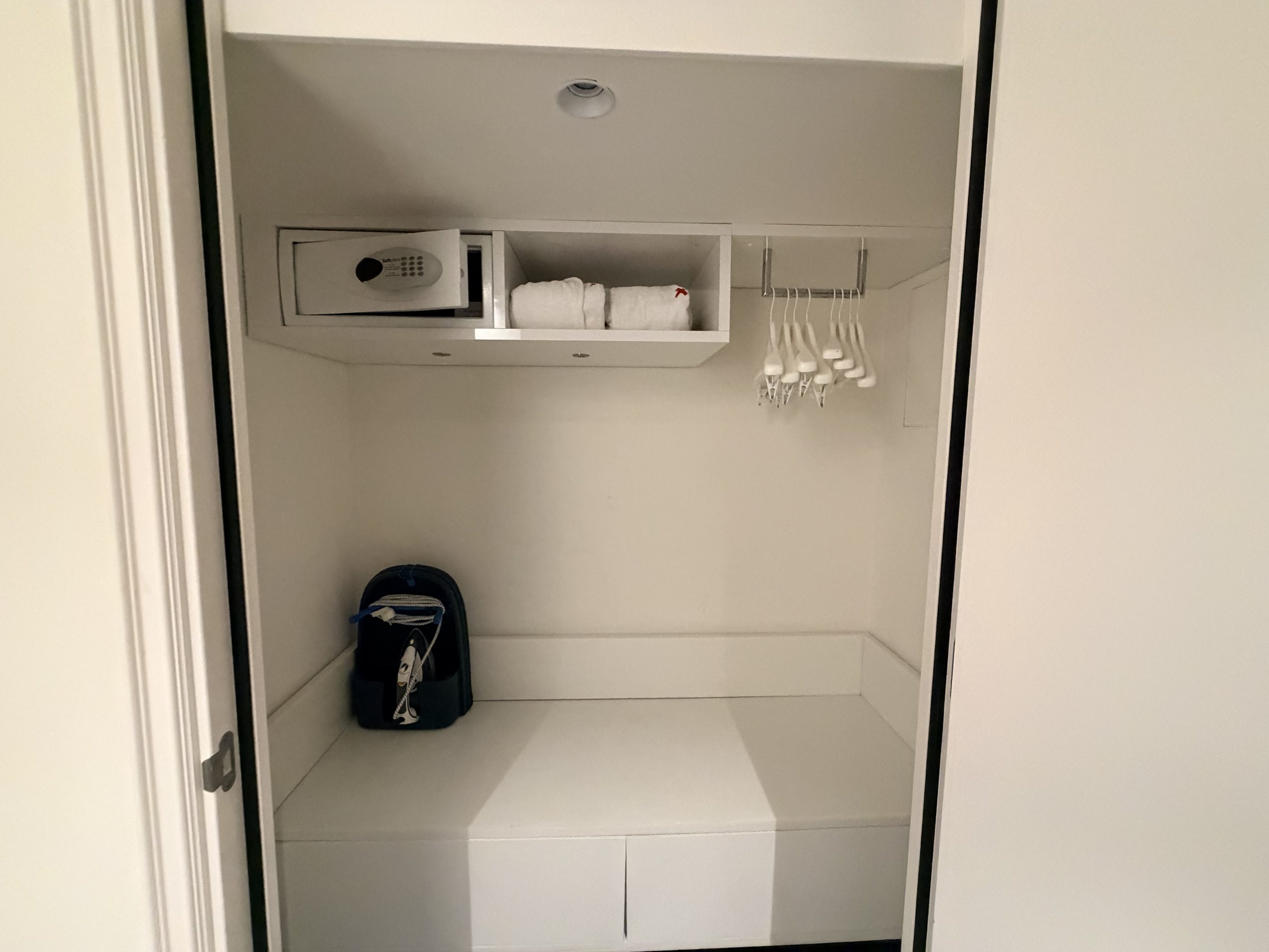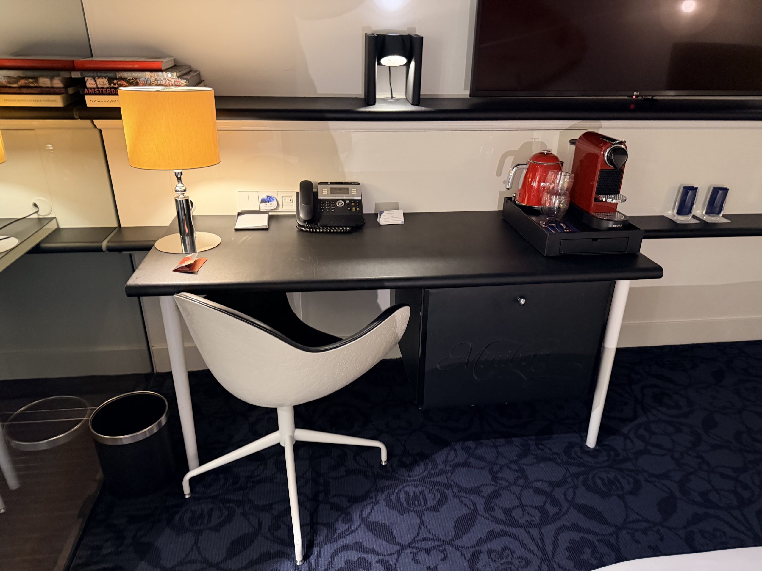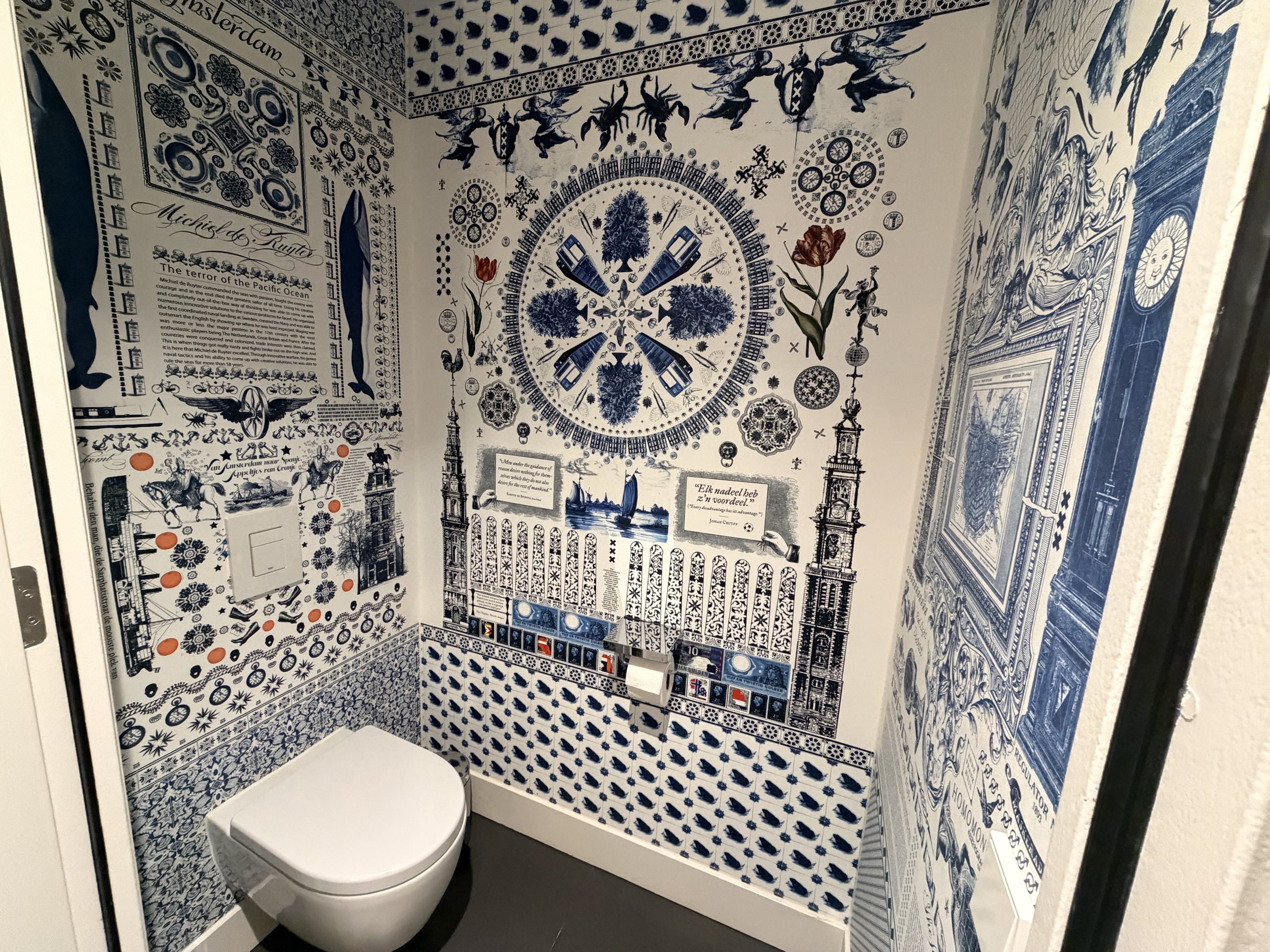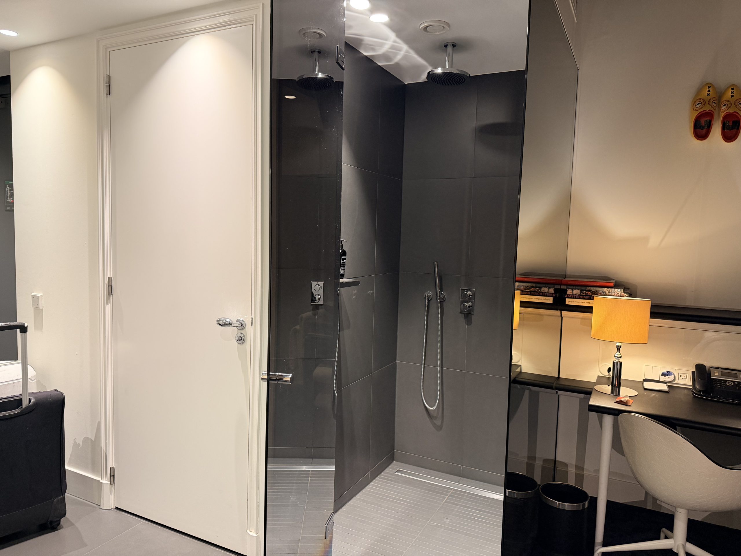 我這次入住的是運河河景大床房,房間大小約28~32平方公尺,一入口就是與房間融為一體的浴室,房間多處會看到阿姆斯特丹的象徵符號「XXX」,關於三個「X」的象徵意義,最常見的解釋是它們代表城市歷史上需要面對的三大災難,也就是洪水,火災與黑死病(瘟疫),這三個「聖安德魯十字」逐漸被解讀為城市歷史苦難與韌性的象徵,也是阿姆斯特丹的市徽。另外,房間內很多小裝飾也都很有趣,像是四處忘了收的盤子,有鬱金香意象的椅子,藍瓷的洗臉槽等等,是個很有設計感的房間。