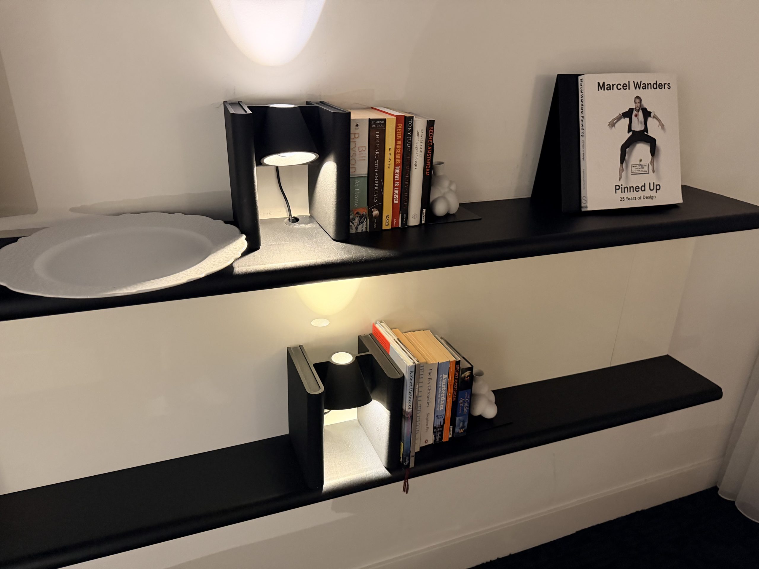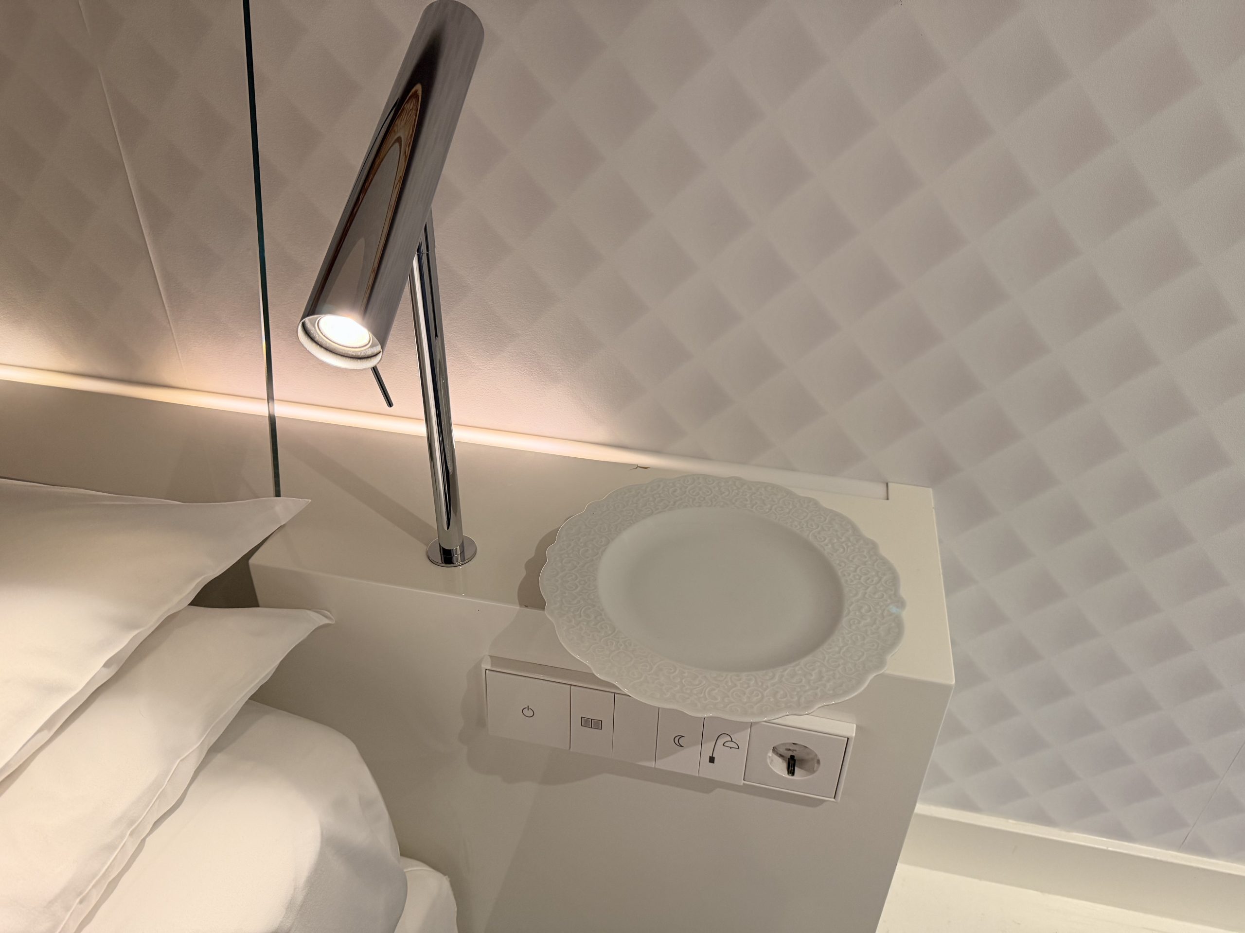 牆面上的書架設計極具巧思,本來以為房務人員沒打掃乾淨,留了一個盤子在書架上,後來才發現盤子是固定在書架上,可以放置物品。而書架上陳列的書也都是真的,無聊的時候可以翻閱