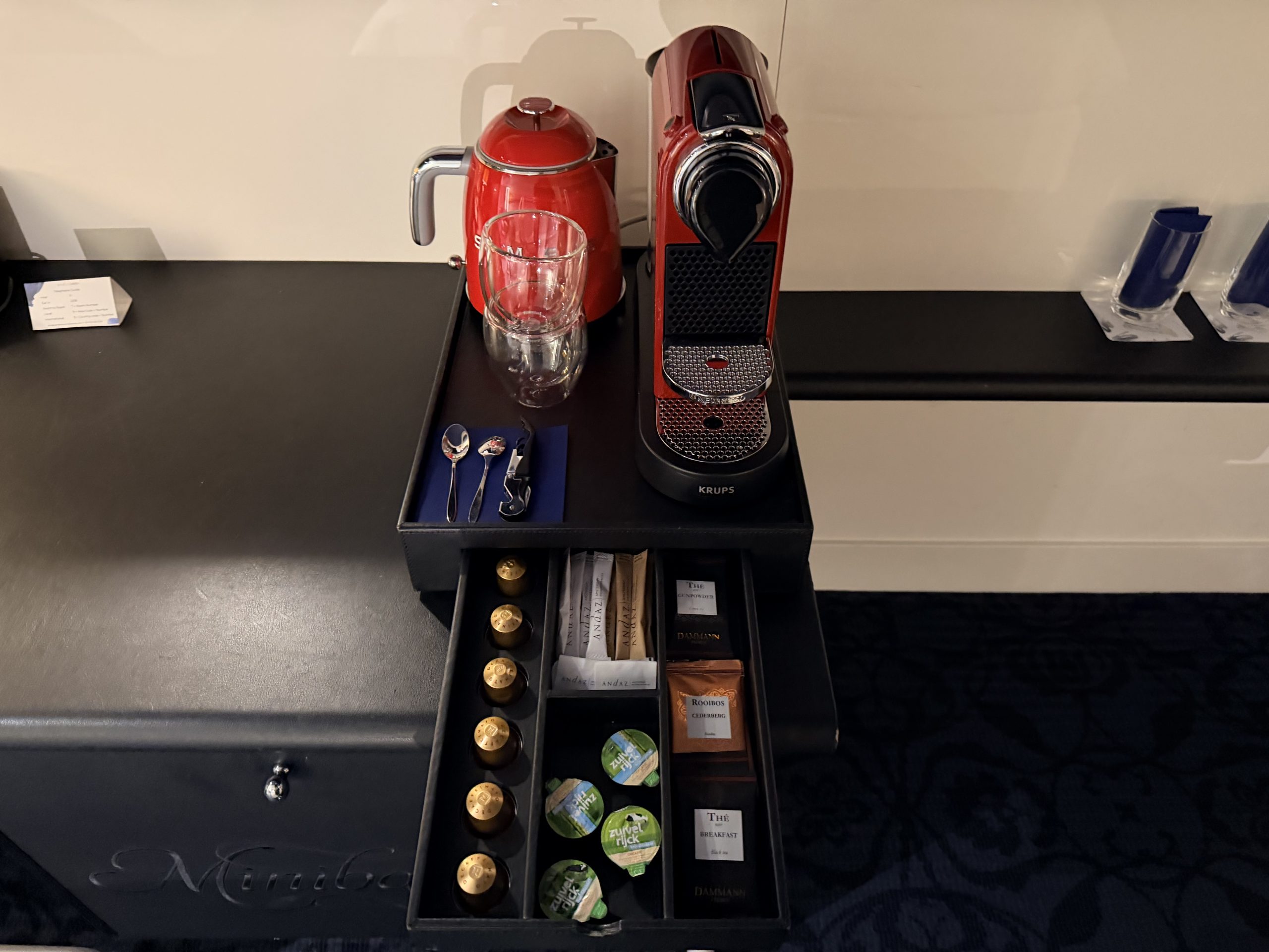 書桌上擺放了「Nespresso」品牌咖啡機,搭配網紅電熱水壺