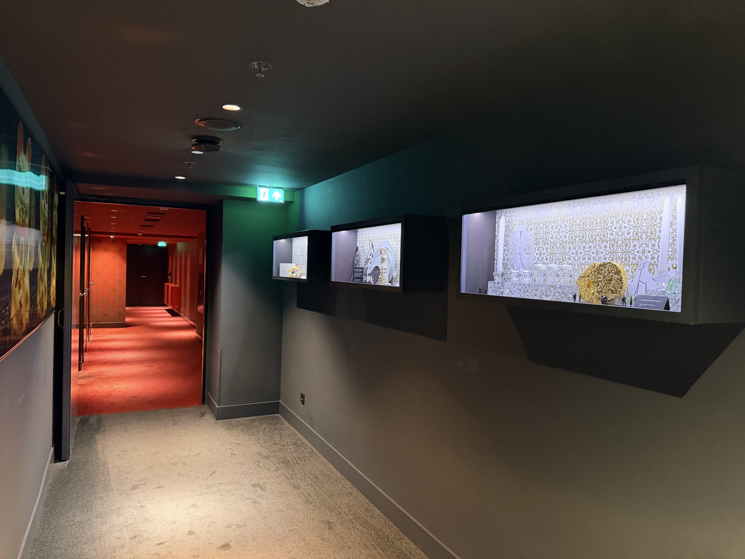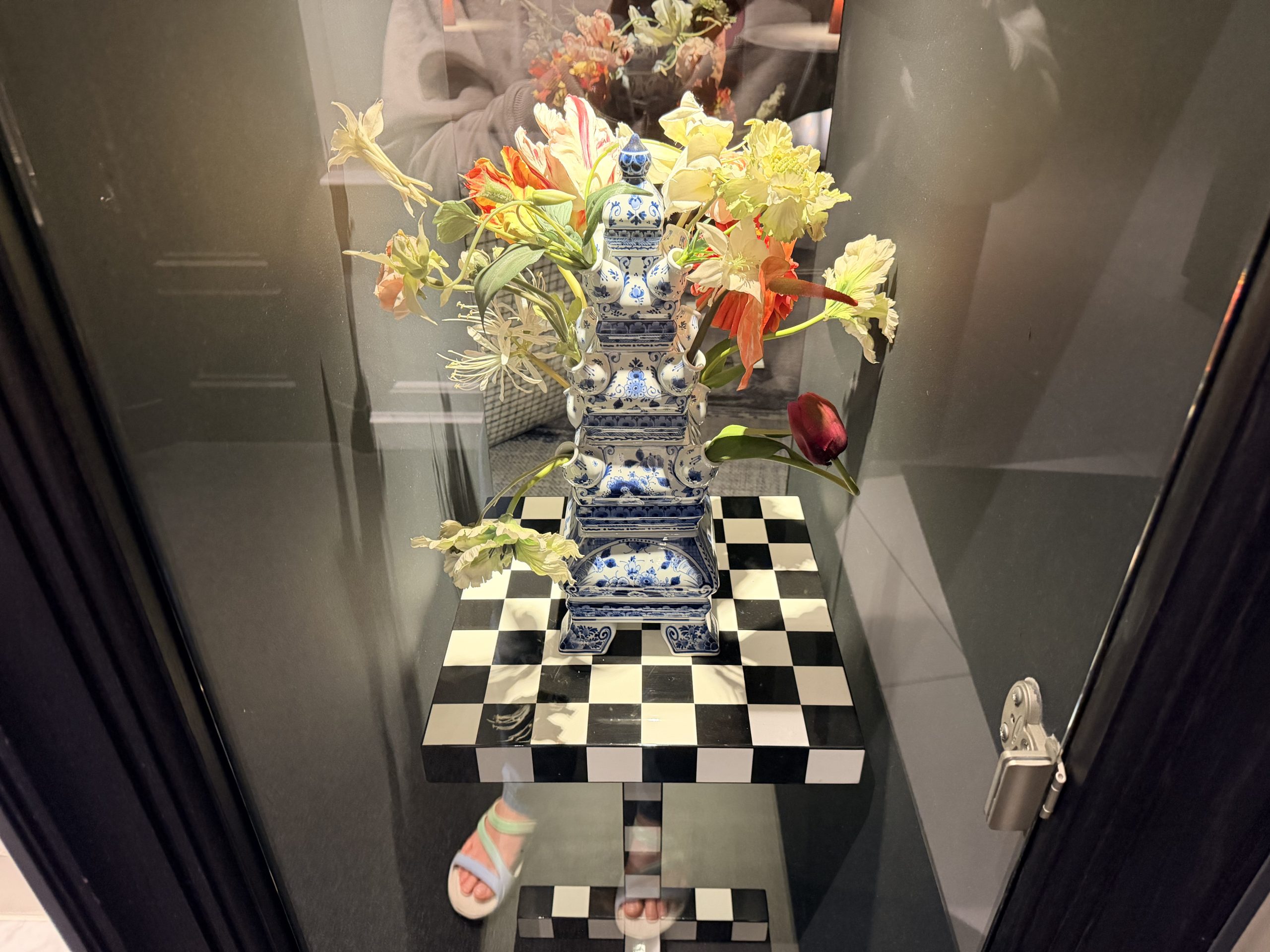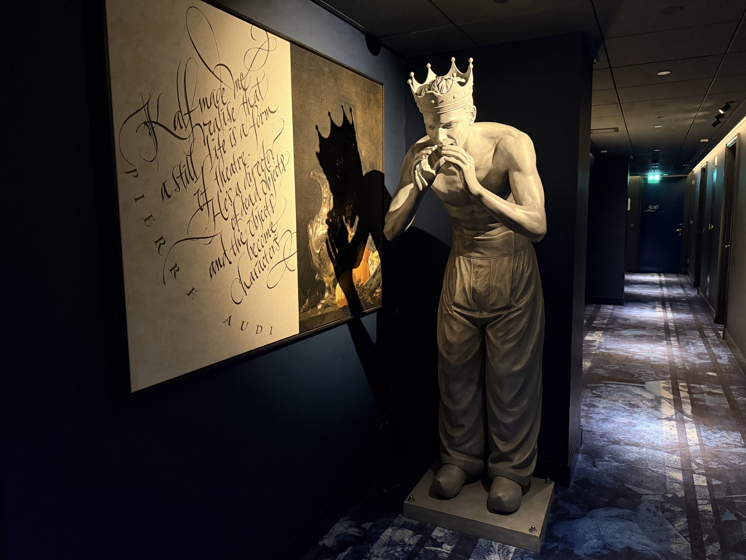 出了電梯以後,房間樓層的設計也很有趣,一出電梯就會看到一個巨大的雕像,名為「失落夢想的王子」(The Prince of Prinsengracht)。這不是一個歷史上真實存在的人物,而是設計師為這棟建築與運河,以及整個安達仕酒店的設計精神,所創造的虛構人物。在整個設計概念當中,如果站在王子捧起的雙手之下,他將幫助你重新想起那些你最珍視並早已遺忘的夢想。我們每個人心裡,都藏著某些曾經擁有,但是後來在日常生活的洪流中,漸漸遺落的夢想,因此透過旅行,或許正是找回那些夢想的契機。而酒店內的這個空間,就是那個讓人短暫從現實抽身,重新與自己的夢相遇的地方。這個雕像遍布在酒店的四周,以各種幽默的方式,矗立在意想不到的地方守護著酒店。