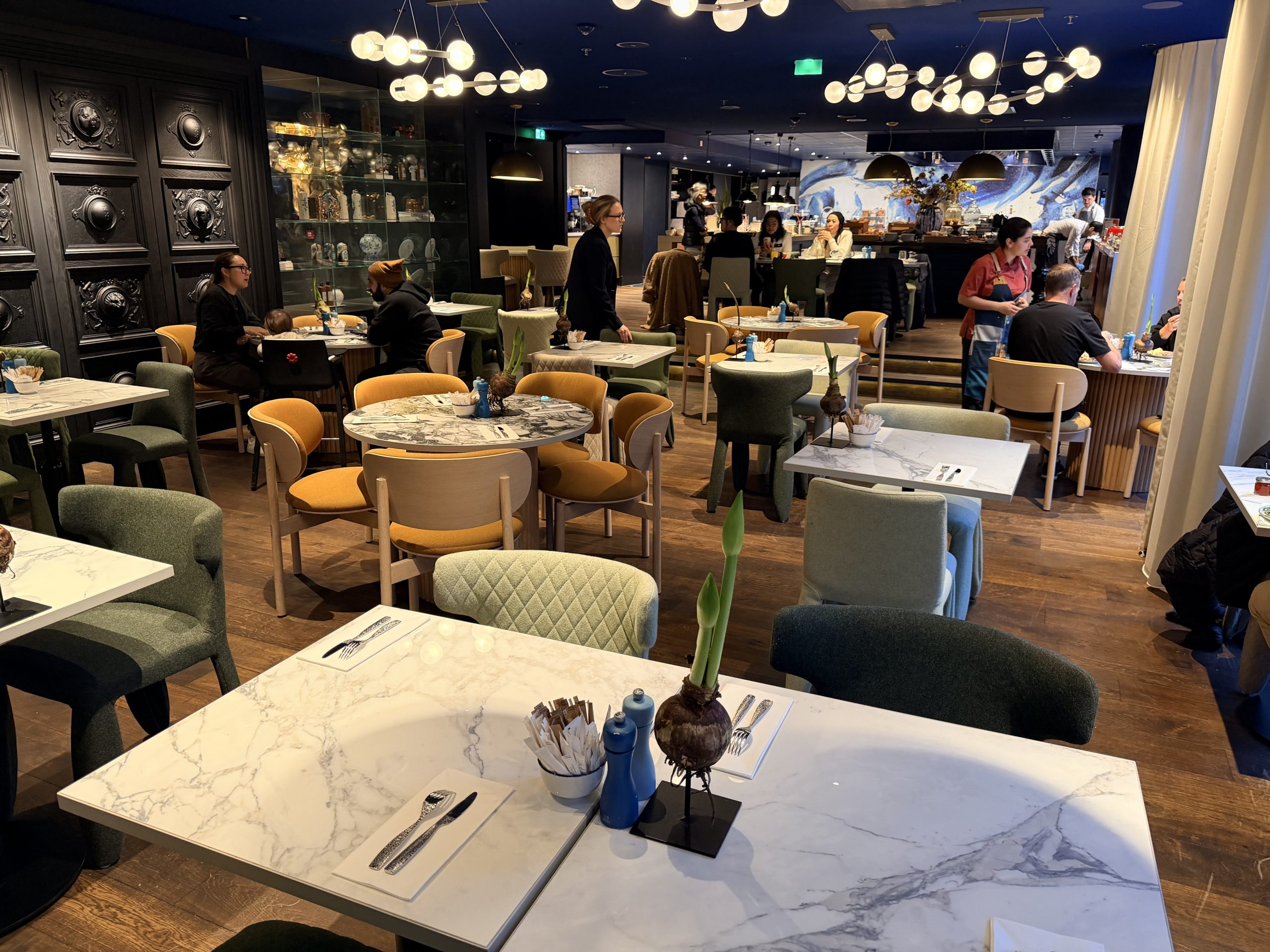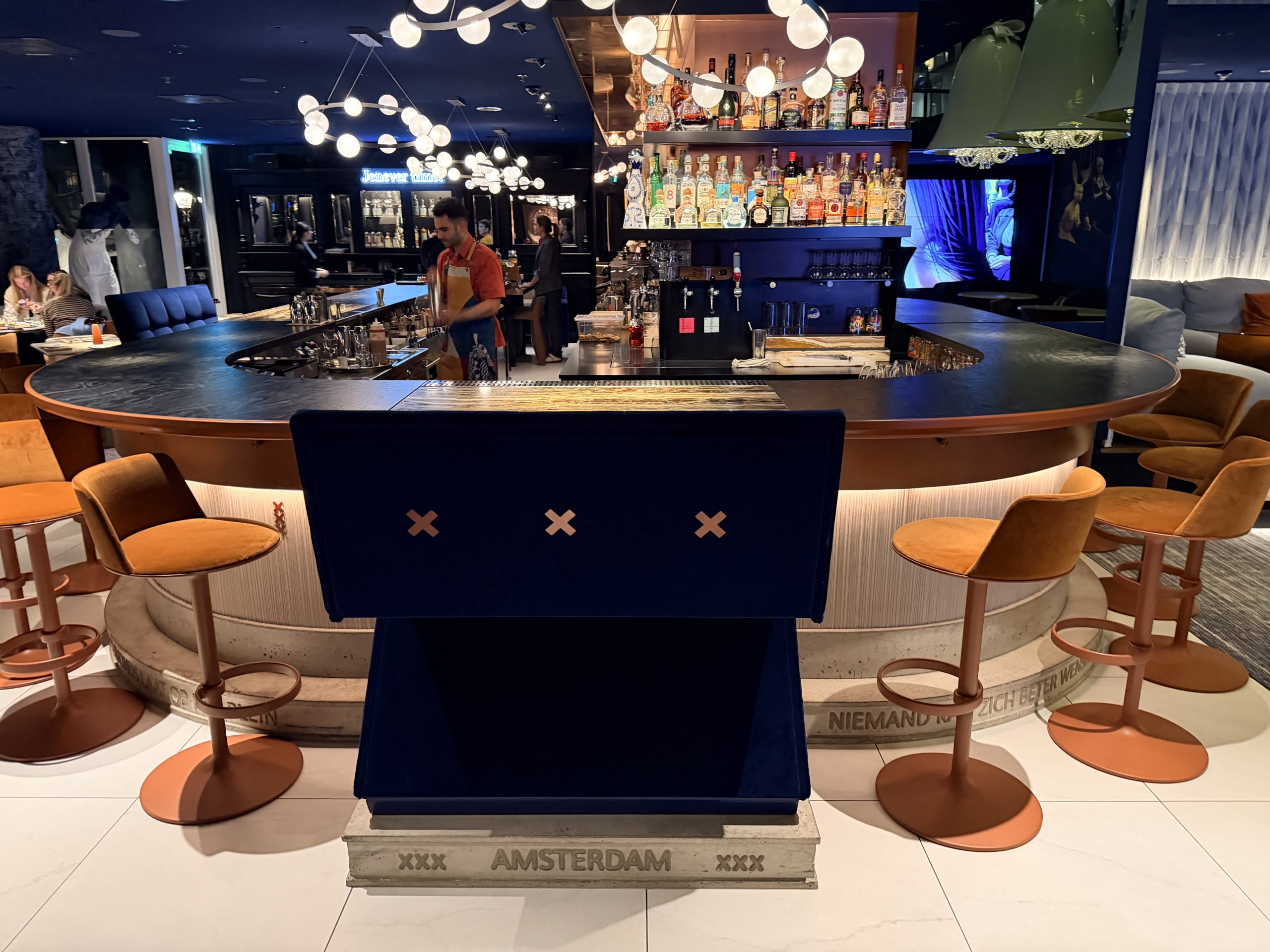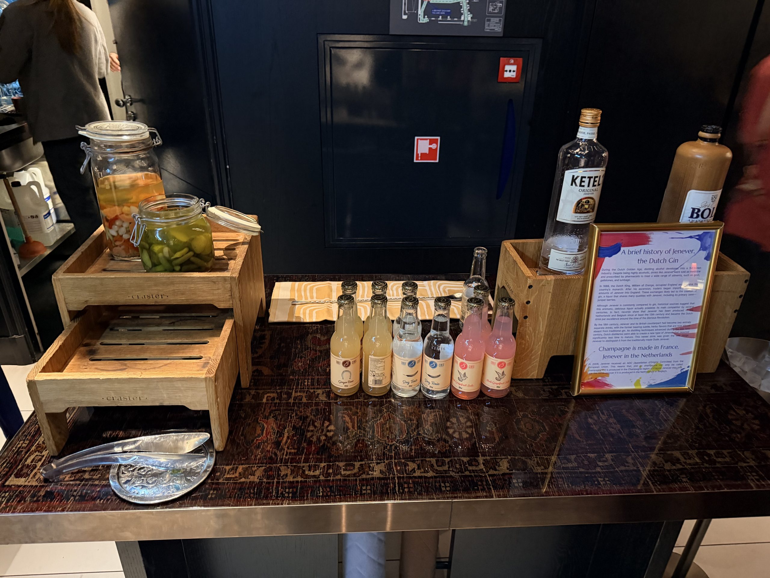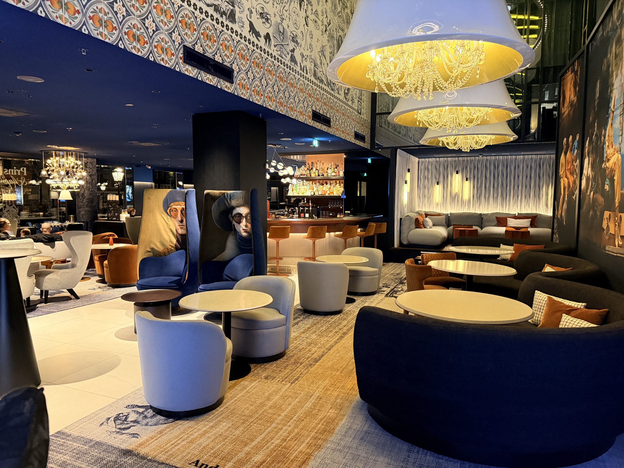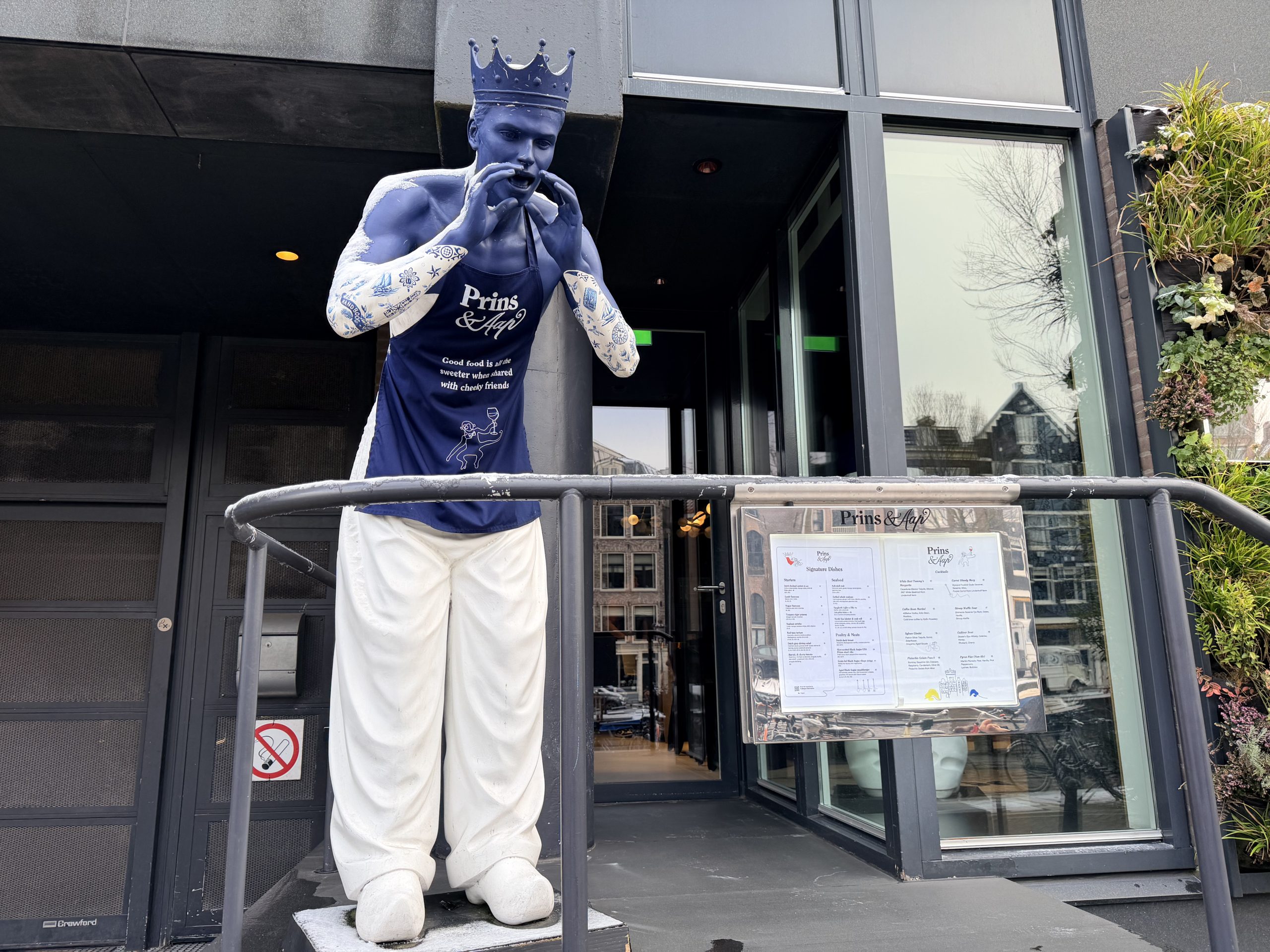 位於大廳的「Restobar Prins & Aap」餐廳,在門口豎立了一個穿著藍色圍裙的王子雕像,相當可愛。每天在特定的「雞尾酒」時段,可以試喝荷蘭琴酒「Jenever」為基底的調酒,還可以試喝新/舊版本的「Jenever」琴酒。這個餐廳屬於大廳的一部分,整體設計非常的時尚,而且餐點部分選項挺多的,口味也都很不錯。