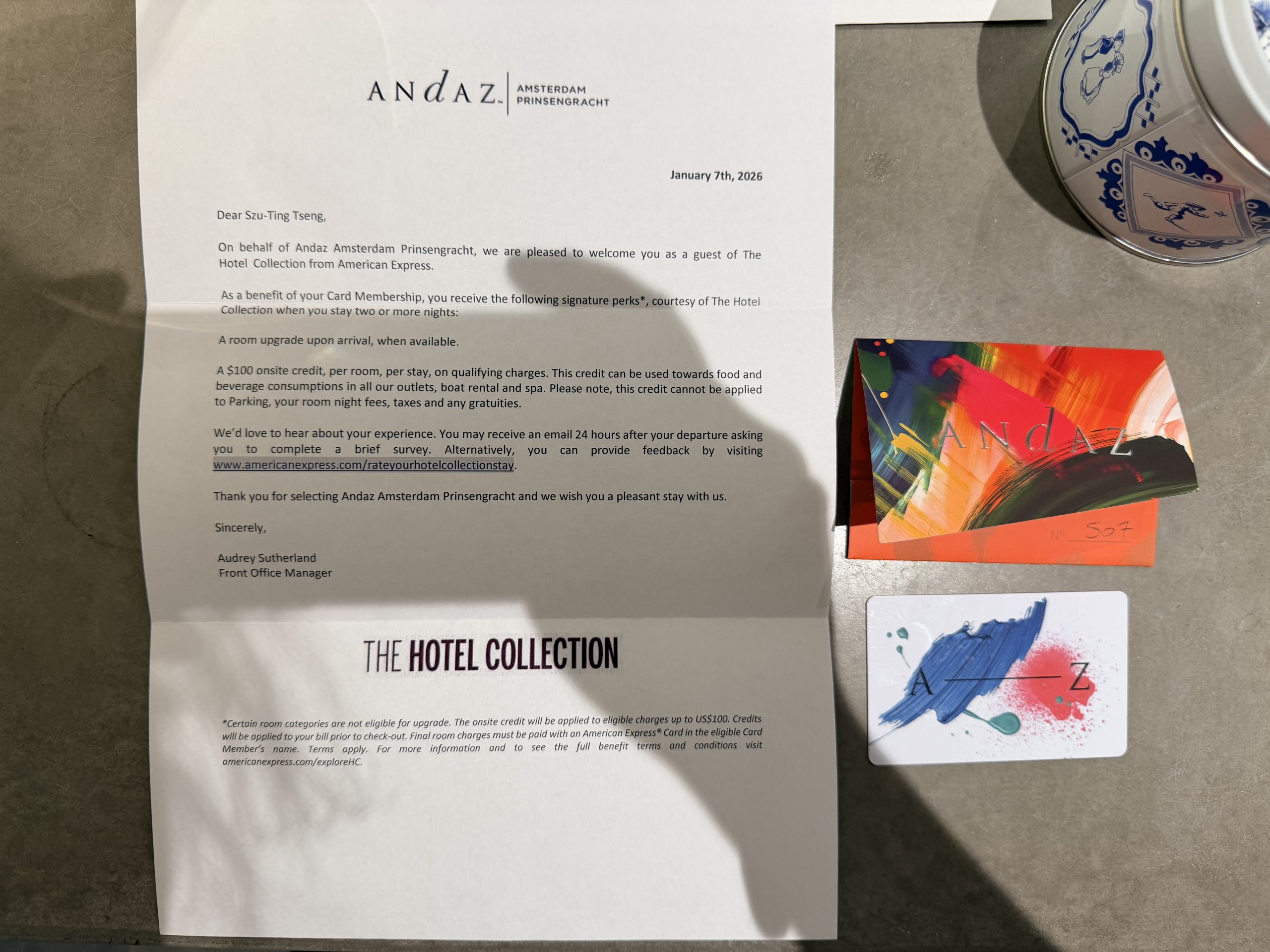 離開前一間入住過,整個體驗超棒的阿姆斯特丹華爾道夫酒店(點我)之後,接著搭計程車前往附近的另一座酒店-阿姆斯特丹王子運河安達仕酒店 (Andaz Amsterdam Prinsengracht)。這次在這裡總共入住三晚,其中前兩晚透過美國運通 (Amex) 白金卡(點我)的「The Hotel Collection」酒店訂房功能(點我)預訂,使用了持卡福利之一的$300美金酒店訂房退額補助,還可享有$100美金的酒店內消費補助。而第三晚則改爲使用大通銀行 (Chase) Sapphire Reserve信用卡(點我)的持卡福利之一-「The Edit」酒店訂房功能預訂,同時也使用了$250美金的酒店訂房退額補助,還同樣享有$100美金的酒店內消費補助。因此兩個訂位紀錄加總起來,等於這三晚的住宿分別獲得了兩筆$100美金的酒店內消費補助,再加上部分房費折抵,以及免費早餐的福利,這就是信用卡玩家「福利疊加」的小確幸。