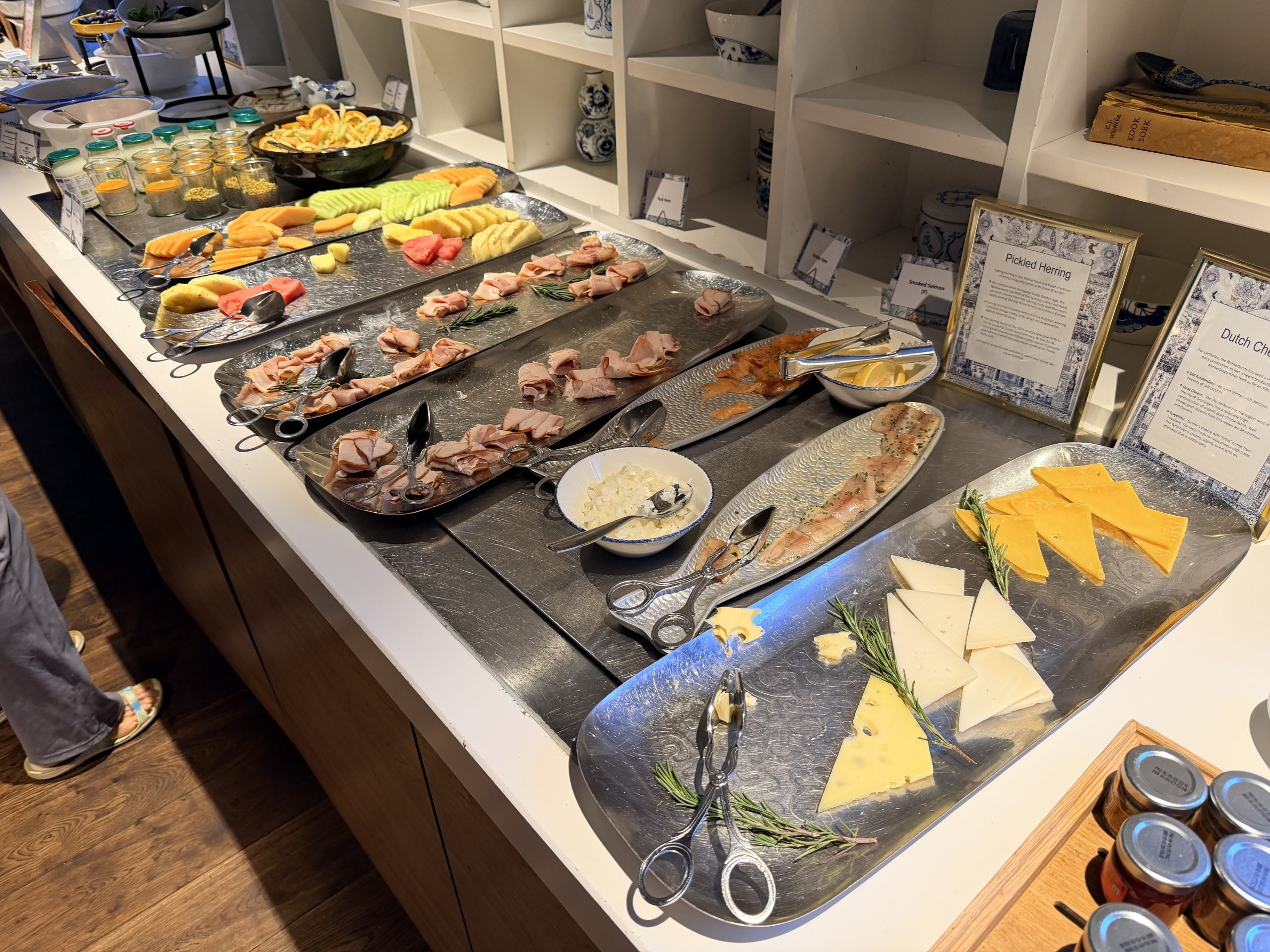 自助式取餐區有煙燻魚肉,冷餐肉片,起司與水果切片