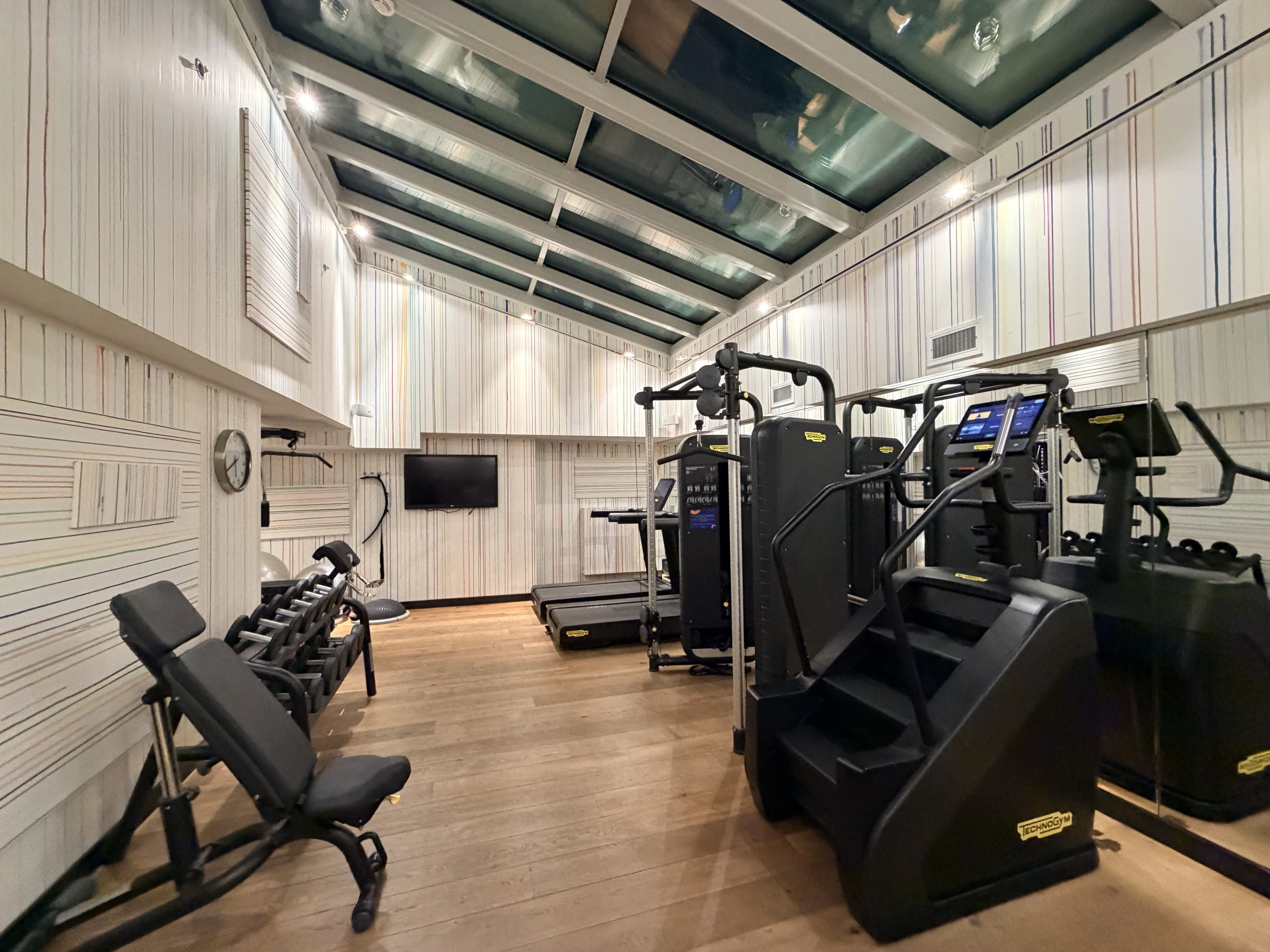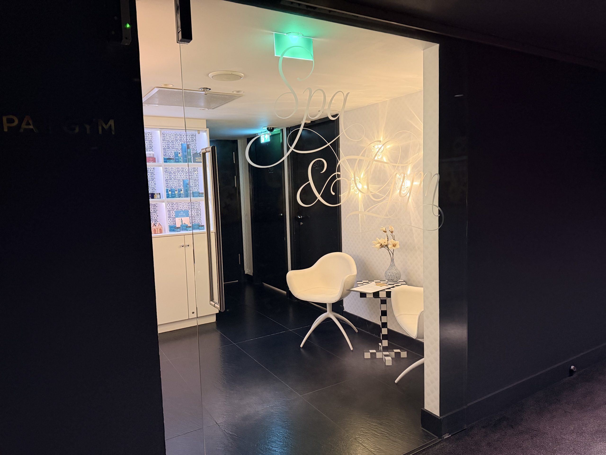 酒店有健身房與芳療 (Spa) 區,健身房與芳療區位於大廳樓層的下一層樓,首先要前往一個整體裝潢「很紅」的區域,接著走過一條底部有鏡子的長廊,自己一個人走感覺有點毛毛的,後來是我媽咪陪我去參觀。芳療區內有桑拿 (Sauna) 室,是男女合併使用的,剛好有兩位男生在裡面,當下不好意思打擾他們,所以稍微參觀一下就離開。